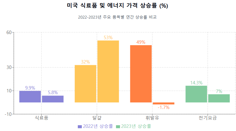 미국의 식료품 가격은 2022년에만 9.9% 증가해 40년 만에 최고 상승률을 기록했습니다. 특히 달걀은 2023년 초 전년 대비 53%나 급등했습니다. 에너지 가격도 마찬가지였습니다. 2022년 6월 휘발유 가격이 갤런당 평균 5달러를 넘었고, 가정용 전기료는 전년 대비 14.3% 상승했습니다.
