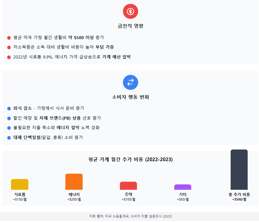 식료품 가격 상승과 에너지 가격 상승은 실질적인 가계 부담 증가로 이어지고 있습니다. 예를 들어, 평균적인 미국 가정의 월간 생활비는 약 500달러 이상 증가했습니다. 특히 저소득층은 소득 대비 생활비 비중이 높아 인플레이션으로 인한 부담이 더 클 수밖에 없습니다. 소비자들은 외식을 줄이고, 할인 매장을 이용하는 등 지출을 크게 줄이고 있습니다.